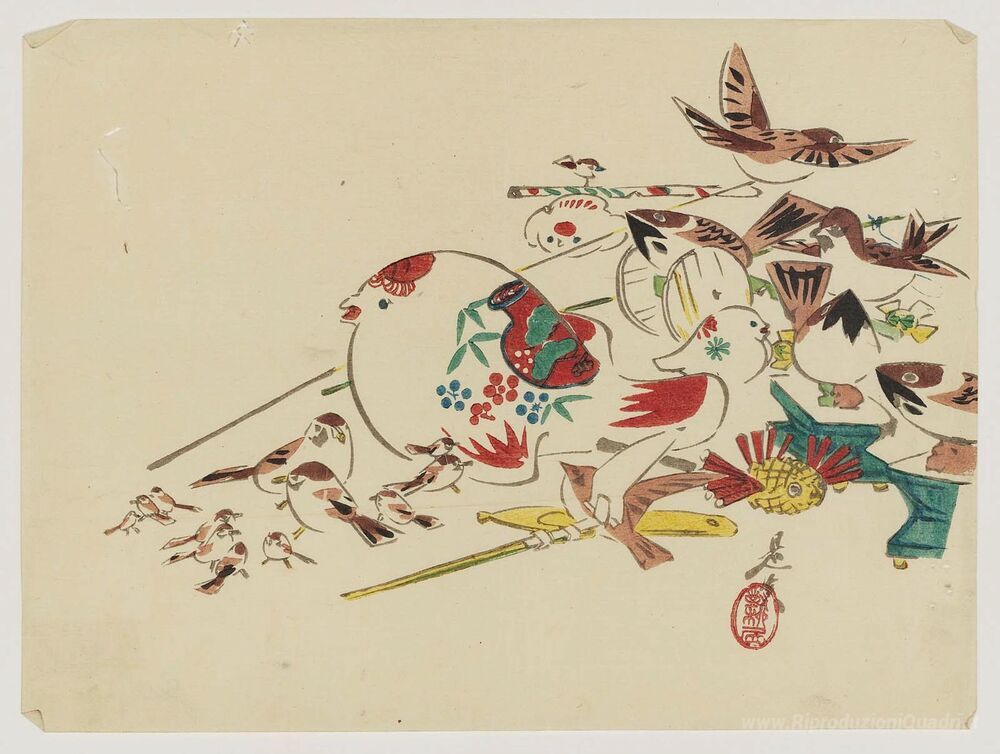 Ti offriamo una riproduzione artigianale su tela dell'opera famosa 'Uccello Giocattoli' di Shibata Zeshin, dal Museo delle Riproduzioni.