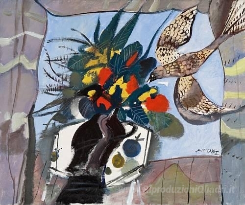 Ti offriamo una riproduzione artigianale su tela dell'opera famosa 'Un uccello in visita' di Dimitris Mytaras, dal Museo delle Riproduzioni.