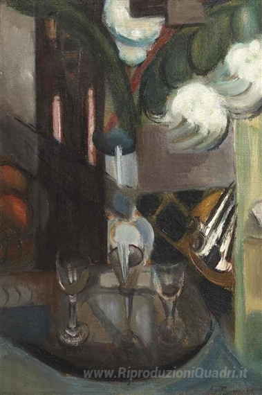 Ti offriamo una riproduzione artigianale su tela dell'opera famosa 'Una vita ancora con una caraffa e bicchieri' di Henri Le Fauconnier, dal Museo delle Riproduzioni.