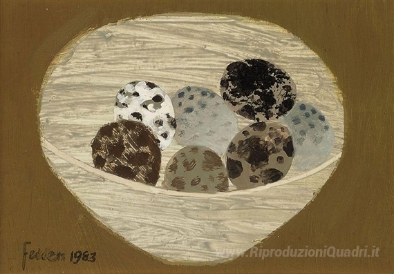 Ti offriamo una riproduzione artigianale su tela dell'opera famosa 'Uova di quaglie' di Mary Fedden, dal Museo delle Riproduzioni.