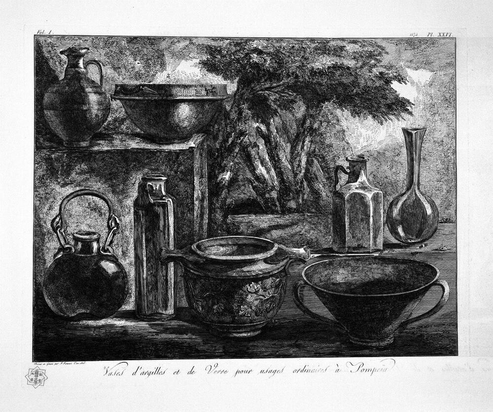 Ti offriamo una riproduzione artigianale su tela dell'opera famosa 'Vasi di argilla e vetro trovati a Pompei' di Giovanni Battista Piranesi, dal Museo delle Riproduzioni.