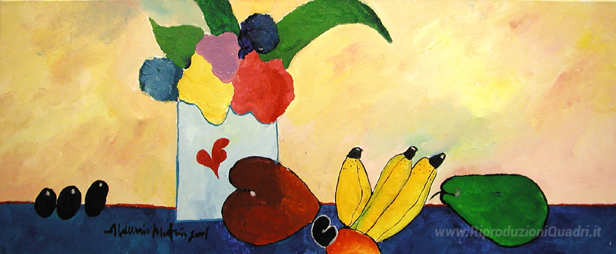 Ti offriamo una riproduzione artigianale su tela dell'opera famosa 'Vaso con fiori e frutta' di Aldemir Martins, dal Museo delle Riproduzioni.