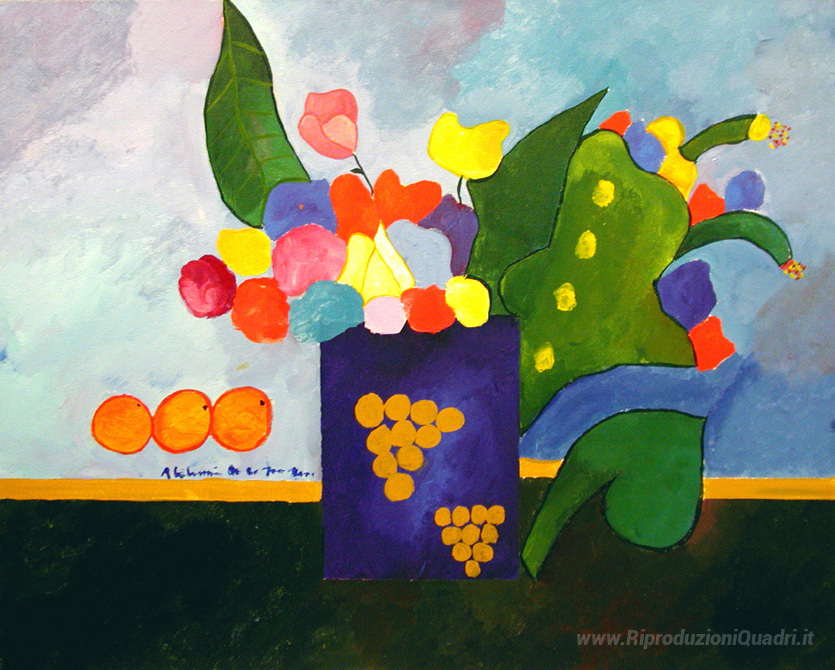 Ti offriamo una riproduzione artigianale su tela dell'opera famosa 'Vaso con fiori e frutta' di Aldemir Martins, dal Museo delle Riproduzioni.