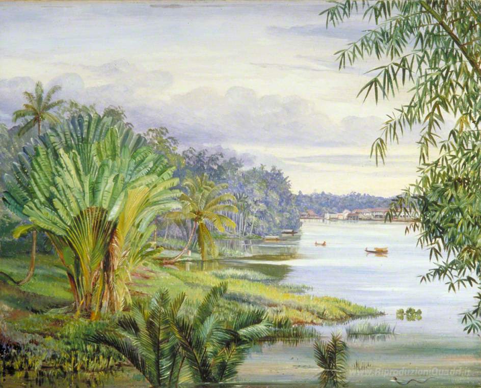 Ti offriamo una riproduzione artigianale su tela dell'opera famosa 'Veduta di Kuching e River, Sarawak, Borneo' di Marianne North, dal Museo delle Riproduzioni.