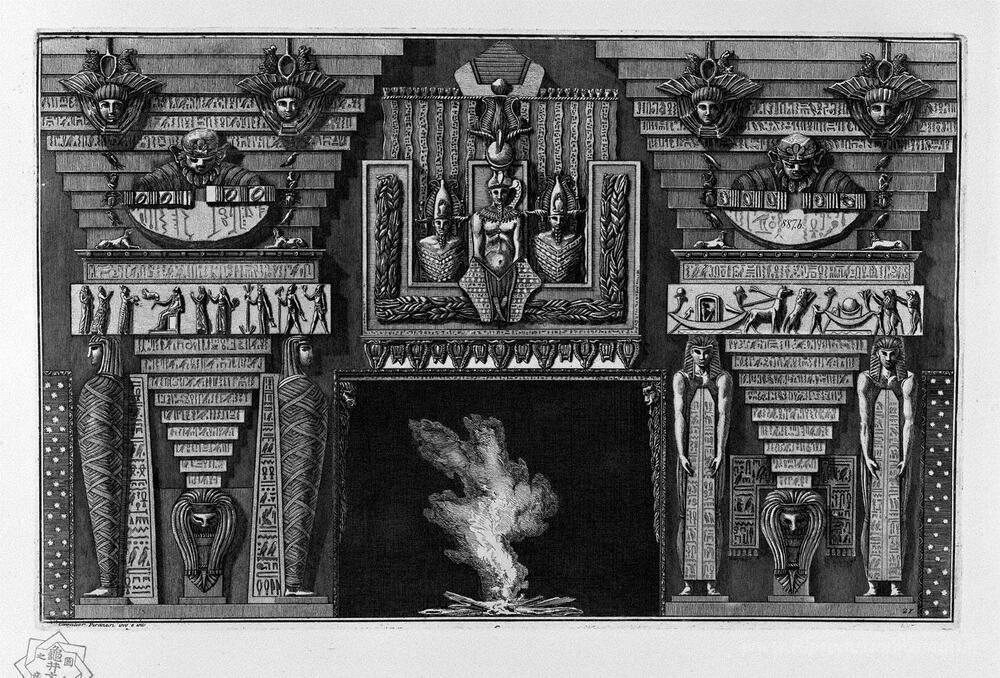 Ti offriamo una riproduzione artigianale su tela dell'opera famosa 'Camino in stile egizio, due figure con il piede giusto, dal mome' di Giovanni Battista Piranesi, dal Museo delle Riproduzioni.