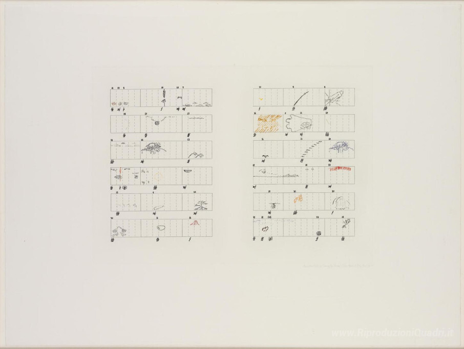 Benvenuti nella nostra esclusiva collezione di dipinti a olio italiani, dove l'arte incontra l'eleganza e la sensibilità. Oggi vi presentiamo un'opera singolare: Valutazione senza Parts (40 Disegni di Thoreau) / Dodici Haiku dell'illustre artista John Cage, noto per la sua innovativa integrazione di suono e immagine. Cage, figura di spicco nel panorama della musica e dell’arte, ha saputo tradurre l'emozione in forma visiva, creando un'opera che invita alla riflessione e alla contemplazione.