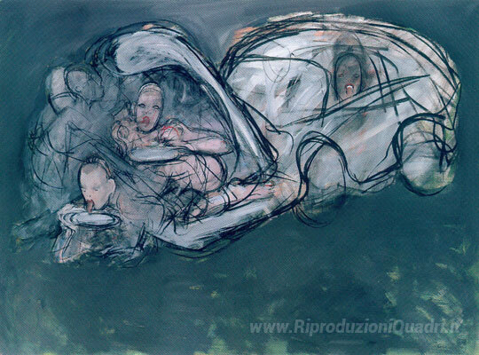 Ti offriamo una riproduzione artigianale su tela dell'opera famosa 'Déjeuner dans la forêt' di Mario Comensoli, dal Museo delle Riproduzioni.
