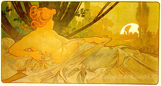 Ti offriamo una riproduzione artigianale su tela dell'opera famosa 'Alba' di Alphonse Mucha, dal Museo delle Riproduzioni.