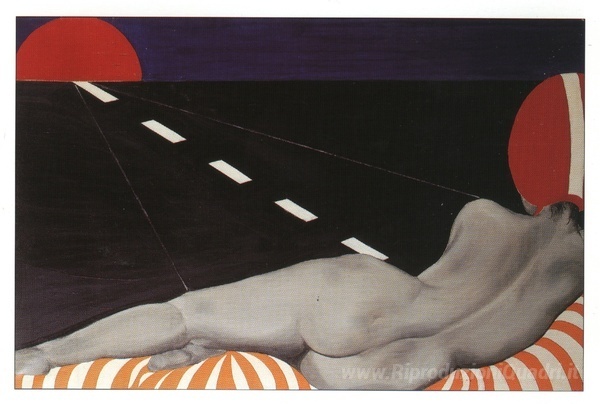 Ti offriamo una riproduzione artigianale su tela dell'opera famosa 'Autostop' di Evelyne Axell, dal Museo delle Riproduzioni.