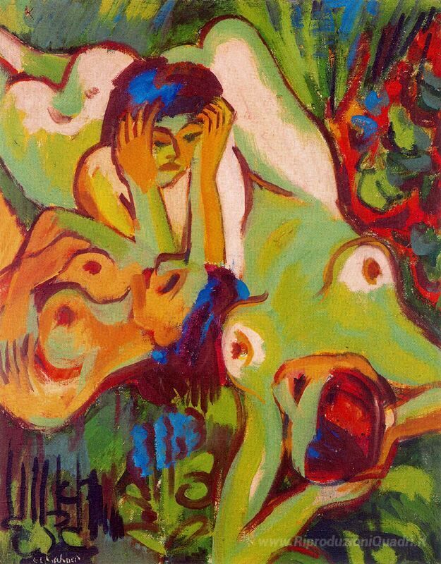 Ti offriamo una riproduzione artigianale su tela dell'opera famosa 'Bagnanti sulla Lawn' di Ernst Ludwig Kirchner, dal Museo delle Riproduzioni.