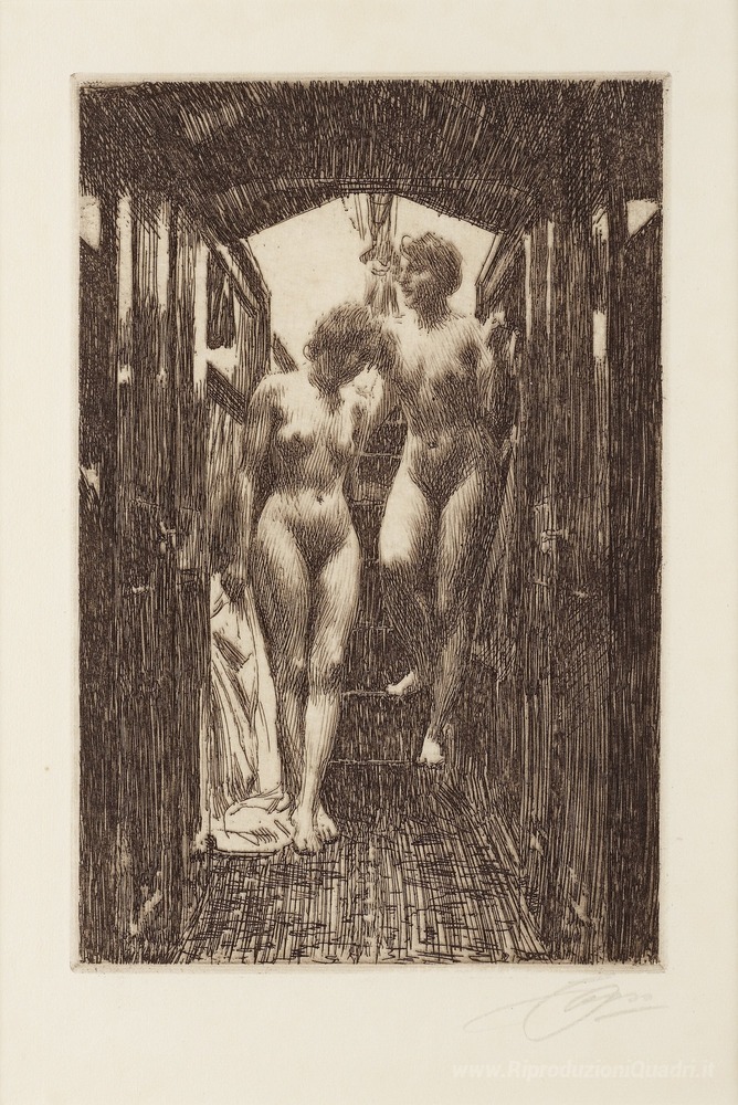 Ti offriamo una riproduzione artigianale su tela dell'opera famosa 'Cabina' di Anders Zorn, dal Museo delle Riproduzioni.