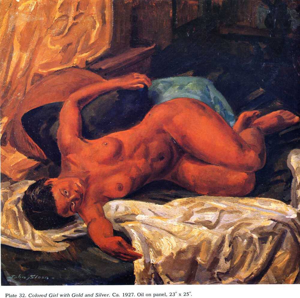 Ti offriamo una riproduzione artigianale su tela dell'opera famosa 'Colorato Ragazza con Oro e Argento' di John French Sloan, dal Museo delle Riproduzioni.