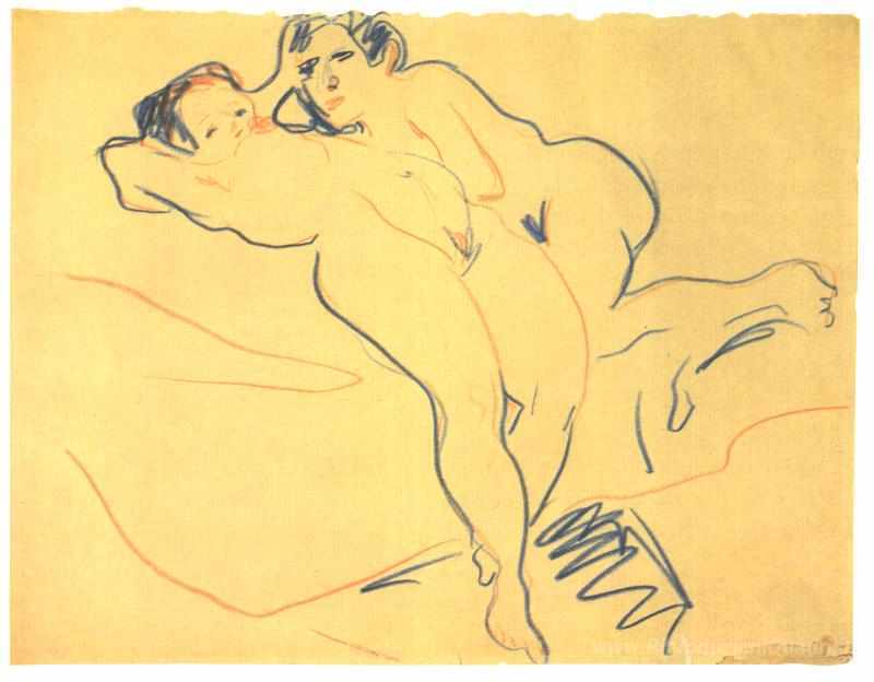 Ti offriamo una riproduzione artigianale su tela dell'opera famosa 'Coppia Riposo' di Ernst Ludwig Kirchner, dal Museo delle Riproduzioni.