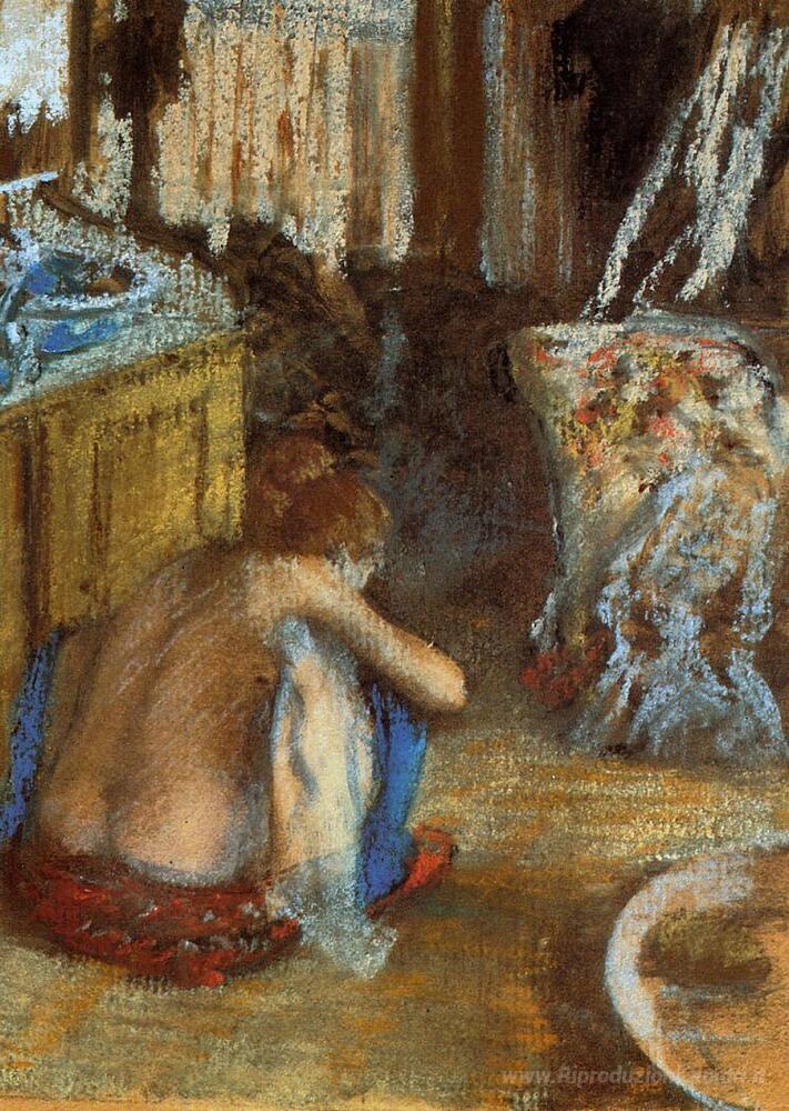 Ti offriamo una riproduzione artigianale su tela dell'opera famosa 'Donna che accovaccia' di Edgar Degas, dal Museo delle Riproduzioni.