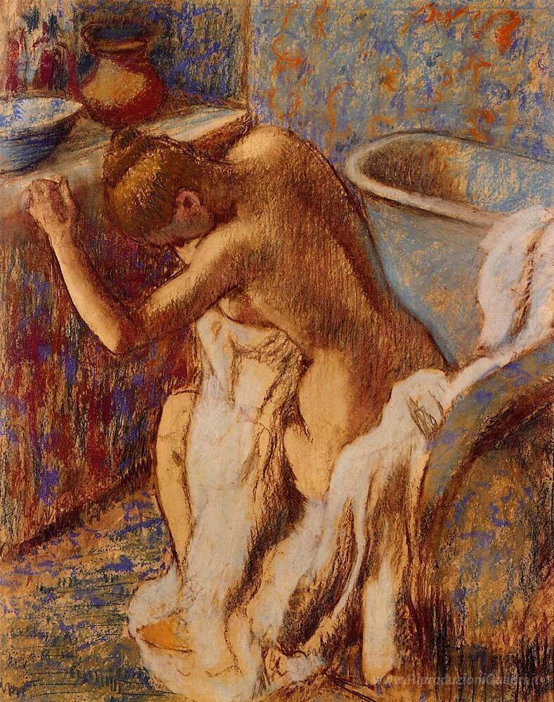 Ti offriamo una riproduzione artigianale su tela dell'opera famosa 'Donna che si asciuga' di Edgar Degas, dal Museo delle Riproduzioni.