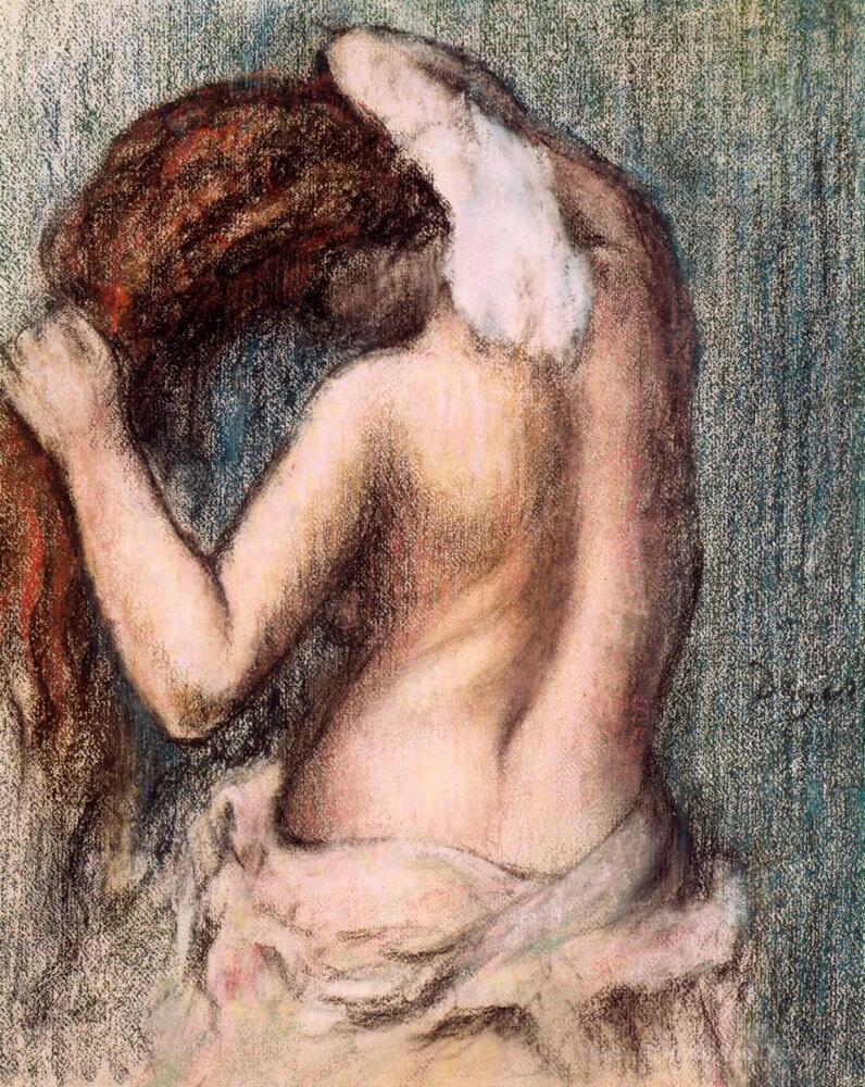 Ti offriamo una riproduzione artigianale su tela dell'opera famosa 'Donna che si asciuga' di Edgar Degas, dal Museo delle Riproduzioni.