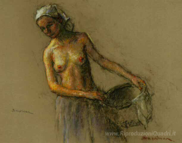 Ti offriamo una riproduzione artigianale su tela dell'opera famosa 'Donna con cesto' di Robert Brackman, dal Museo delle Riproduzioni.