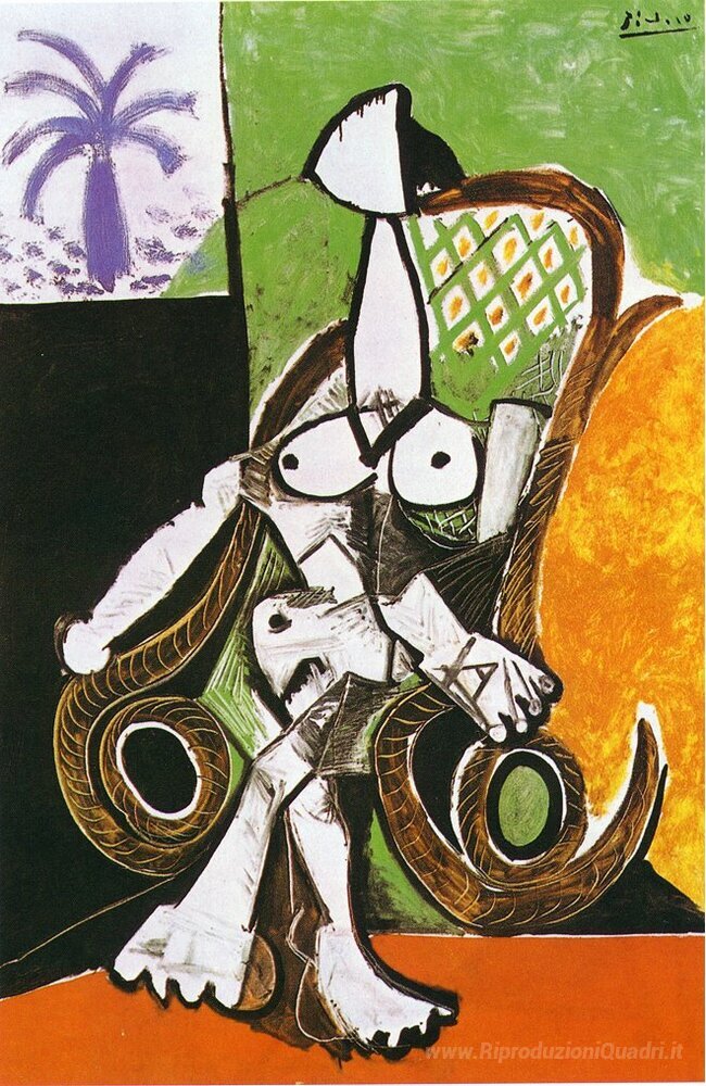 Ti offriamo una riproduzione artigianale su tela dell'opera famosa 'Donna nuda in sedia a dondolo' di Pablo Picasso, dal Museo delle Riproduzioni.