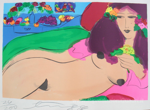 Ti offriamo una riproduzione artigianale su tela dell'opera famosa 'Donne con i fiori' di Walasse Ting, dal Museo delle Riproduzioni.