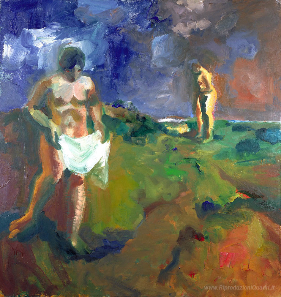 Ti offriamo una riproduzione artigianale su tela dell'opera famosa 'Due Bagnanti' di Elmer Bischoff, dal Museo delle Riproduzioni.