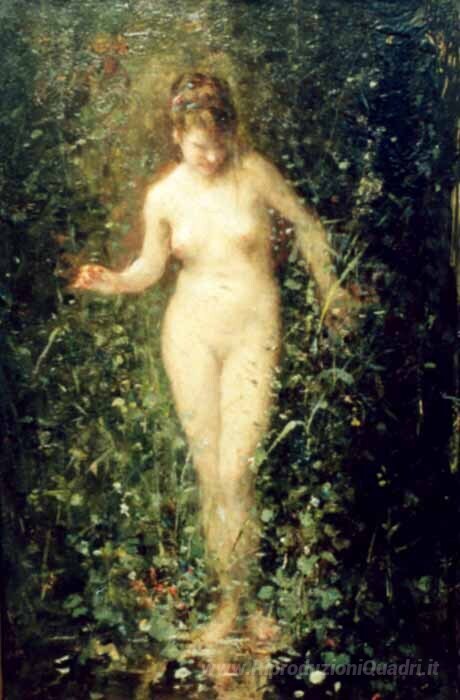 Ti offriamo una riproduzione artigianale su tela dell'opera famosa 'Entrare nel bagno' di Nicolae Grigorescu, dal Museo delle Riproduzioni.