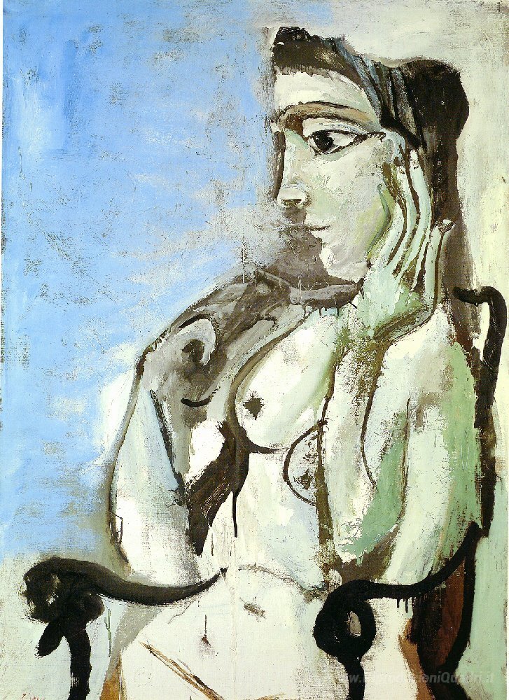 Ti offriamo una riproduzione artigianale su tela dell'opera famosa 'Femmina nudo seduto in poltrona' di Pablo Picasso, dal Museo delle Riproduzioni.