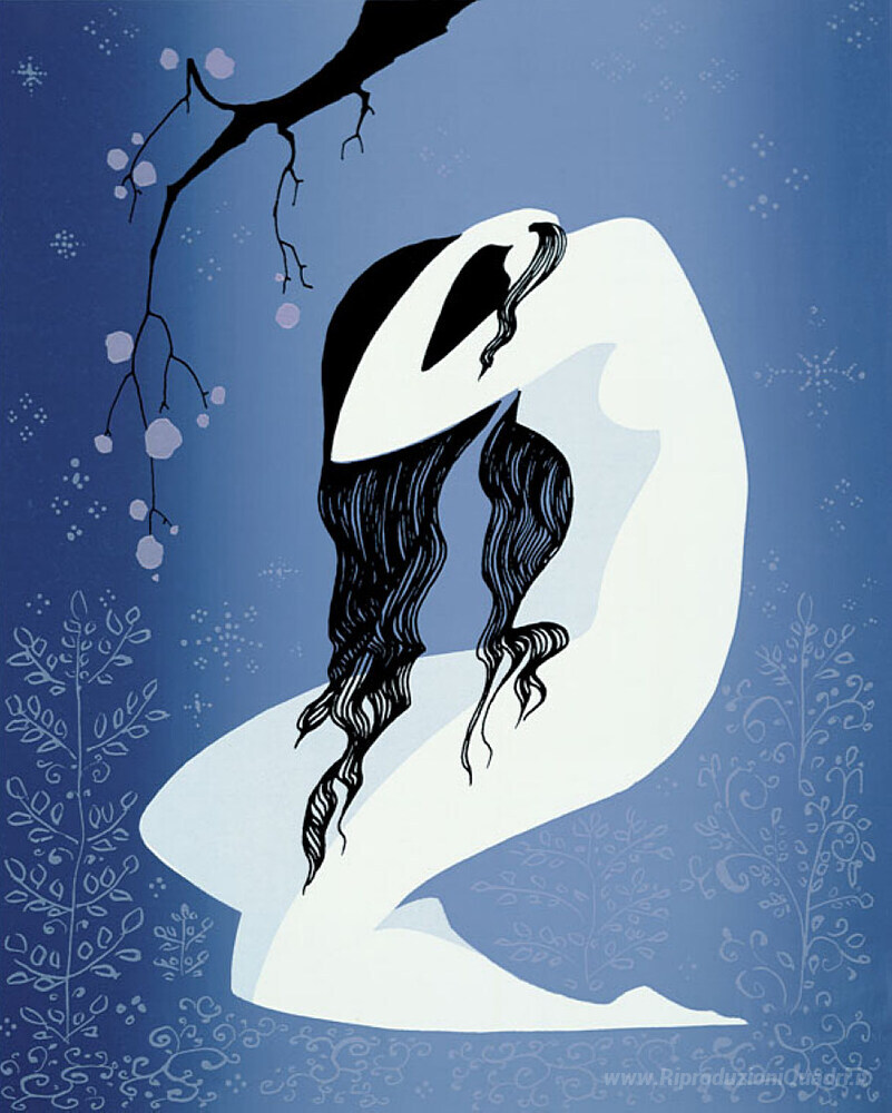Ti offriamo una riproduzione artigianale su tela dell'opera famosa 'Figura in blu Grays' di Eyvind Earle, dal Museo delle Riproduzioni.
