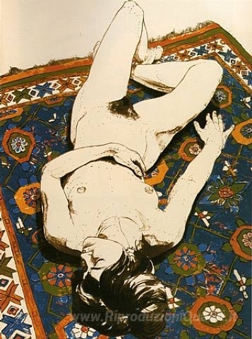 Ti offriamo una riproduzione artigianale su tela dell'opera famosa 'Figura Sdraiato sul tappeto' di Philip Pearlstein, dal Museo delle Riproduzioni.