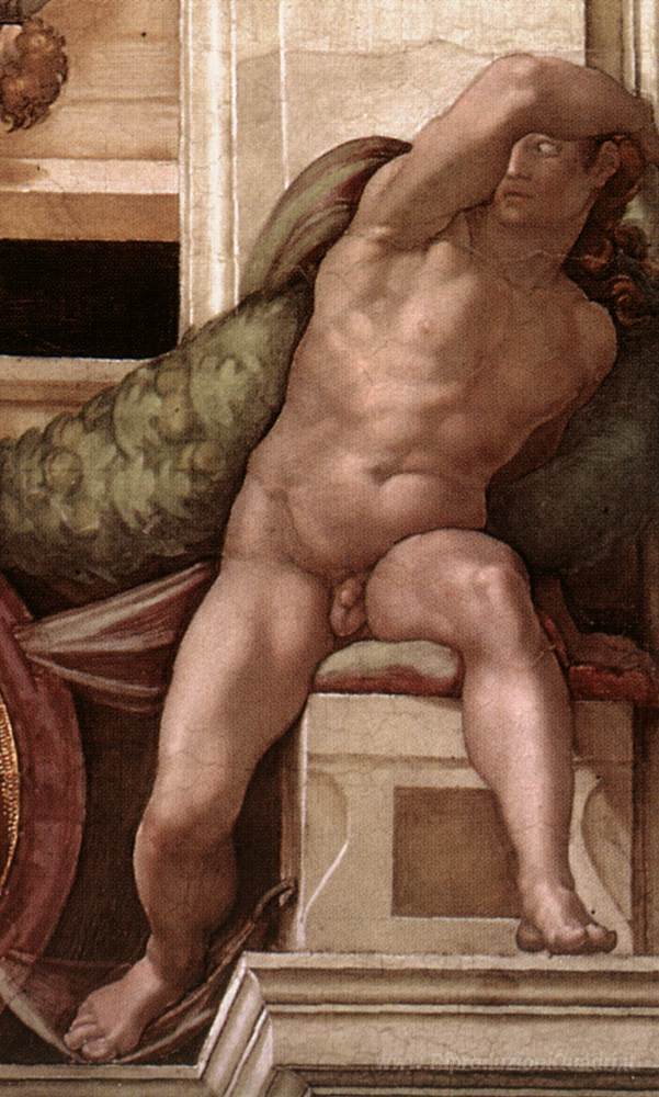 Ti offriamo una riproduzione artigianale su tela dell'opera famosa 'Ignudo' di Michelangelo, dal Museo delle Riproduzioni.