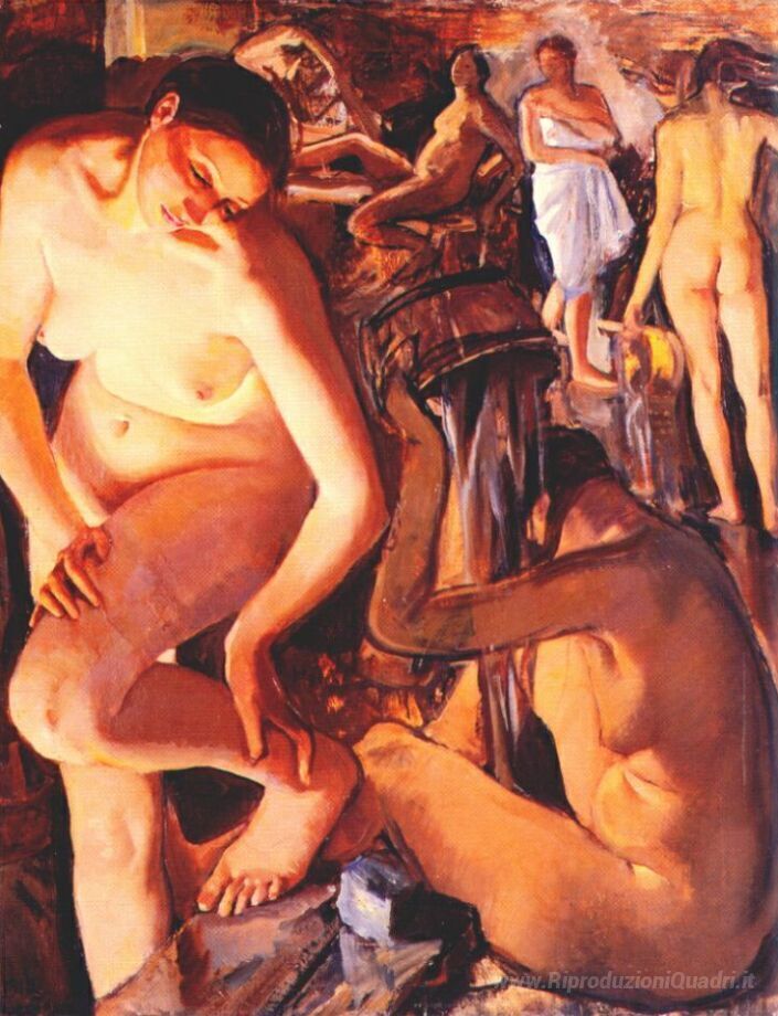 Ti offriamo una riproduzione artigianale su tela dell'opera famosa 'Il Bathhouse' di Zinaida Serebriakova, dal Museo delle Riproduzioni.