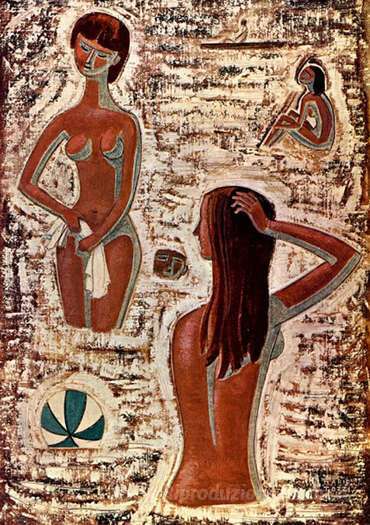Ti offriamo una riproduzione artigianale su tela dell'opera famosa 'Il Pallone un Spicchi Bianchi e Verdi (Fanciulle al Mare)' di Mario Tozzi, dal Museo delle Riproduzioni.