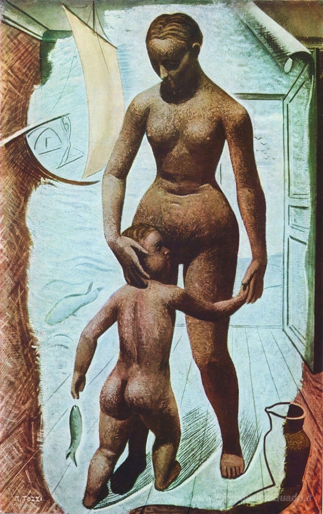 Ti offriamo una riproduzione artigianale su tela dell'opera famosa 'La Famiglia del Pescatore' di Mario Tozzi, dal Museo delle Riproduzioni.