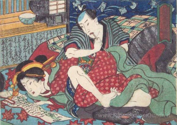 Ti offriamo una riproduzione artigianale su tela dell'opera famosa 'La lettera' di Utagawa Kunisada, dal Museo delle Riproduzioni.