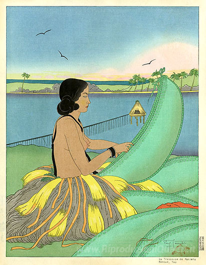 Ti offriamo una riproduzione artigianale su tela dell'opera famosa 'La Tresseuse De Paniers. Remoue, Yap' di Paul Jacoulet, dal Museo delle Riproduzioni.
