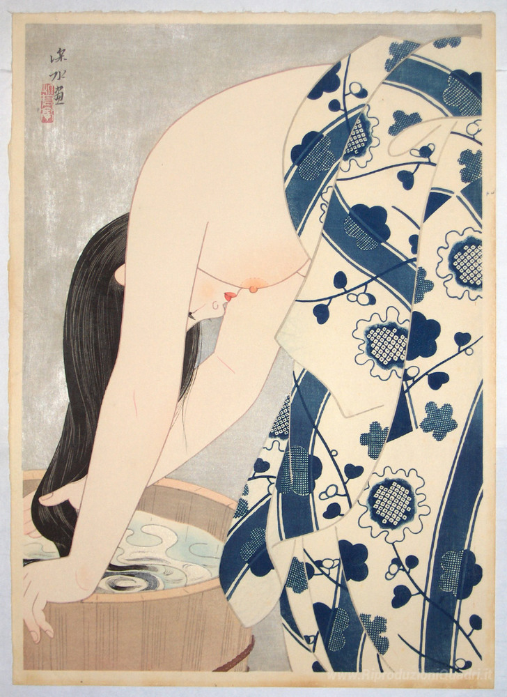 Ti offriamo una riproduzione artigianale su tela dell'opera famosa 'Lavare i capelli' di Ito Shinsui, dal Museo delle Riproduzioni.