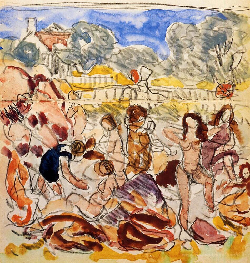Ti offriamo una riproduzione artigianale su tela dell'opera famosa 'Le cifre sulla spiaggia' di Maurice Prendergast, dal Museo delle Riproduzioni.