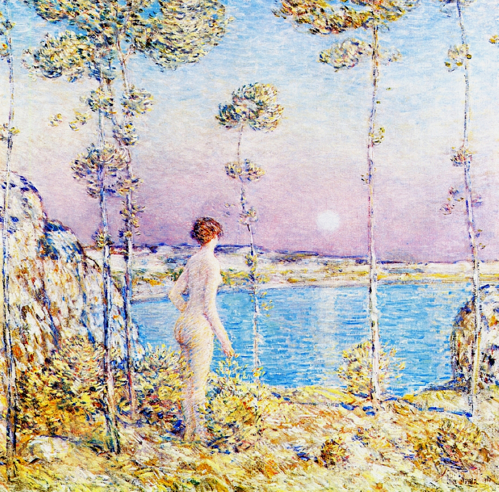 La tecnica a olio di Hassam emana una profonda emozione, trasformando la tela in un'esperienza visiva che coinvolge lo spettatore. La delicata armonia tra il blu della notte e le sfumature calde del tramonto esalta ogni ambiente, portando un tocco di eleganza e raffinatezza. Aggiungere l'opera Moonrise at Sunset nel vostro spazio significa non solo arredare, ma anche creare un'atmosfera unica e ricca di poesia artistica.