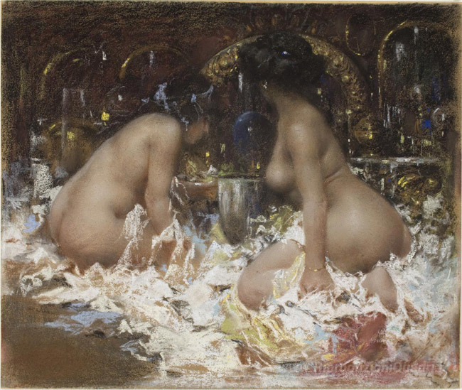 Scoprite la raffinata bellezza dei dipinti a olio italiani con l'opera Nel Boudoir dell'acclamato artista Antonio Mancini. Nato a Roma nel 1852, Mancini è noto per il suo stile distintivo che unisce il realismo all'impressionismo, creando opere che catturano l'essenza e l'emozione di ogni soggetto. La sua maestria nella tecnica del chiaroscuro e nei toni vibranti conferisce alle sue opere una profondità unica, trasformando semplici scene quotidiane in esperienze visive straordinarie.