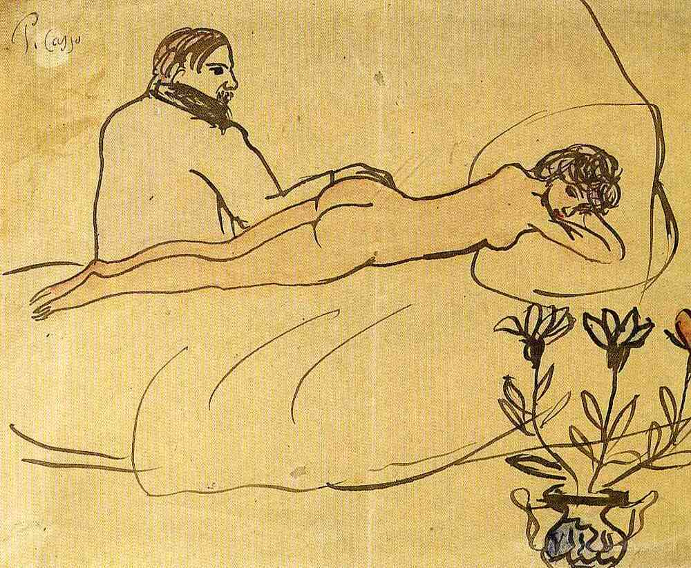 Ti offriamo una riproduzione artigianale su tela dell'opera famosa 'Nudo con Picasso dai suoi piedi' di Pablo Picasso, dal Museo delle Riproduzioni.