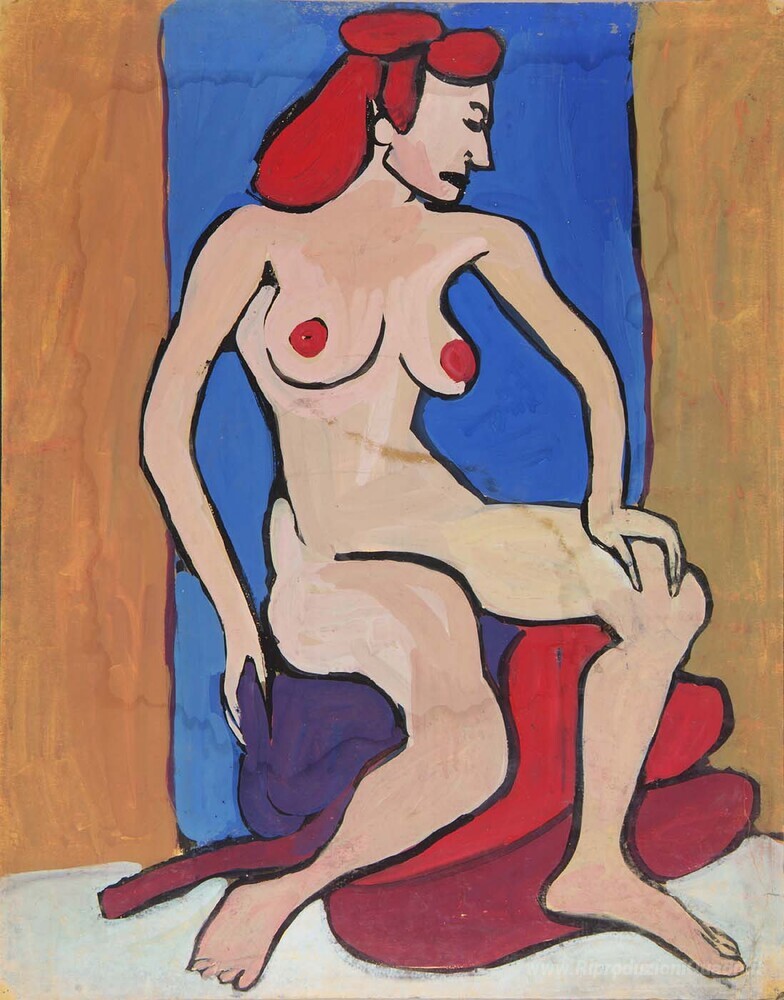 Ti offriamo una riproduzione artigianale su tela dell'opera famosa 'Nudo femminile con capelli rossi seduto su cuscini' di William H. Johnson, dal Museo delle Riproduzioni.