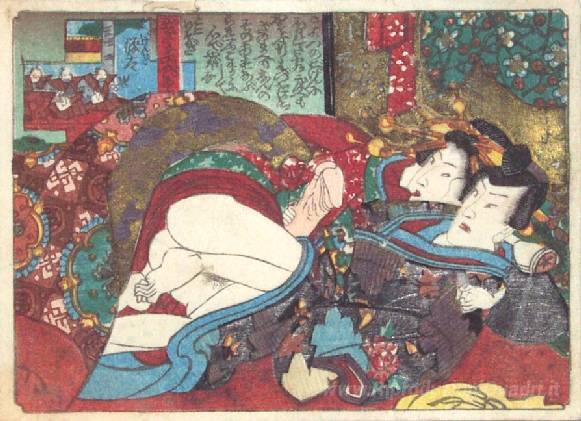 Ti offriamo una riproduzione artigianale su tela dell'opera famosa 'Preliminari Sotto il futon' di Utagawa Kunisada, dal Museo delle Riproduzioni.