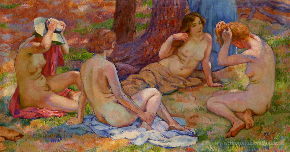 Ti offriamo una riproduzione artigianale su tela dell'opera famosa 'Quattro Bagnanti' di Theo van Rysselberghe, dal Museo delle Riproduzioni.
