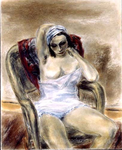 Ti offriamo una riproduzione artigianale su tela dell'opera famosa 'Ragazza che pensa' di Yasuo Kuniyoshi, dal Museo delle Riproduzioni.
