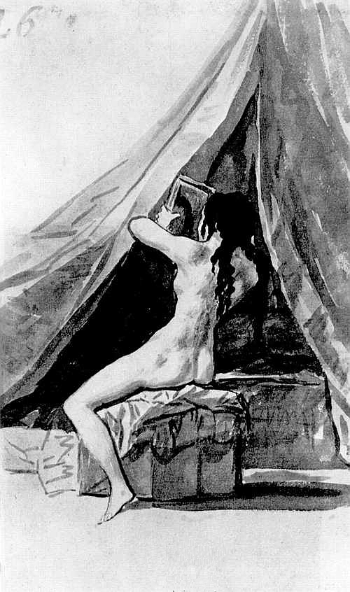 Ti offriamo una riproduzione artigianale su tela dell'opera famosa 'Ragazza nuda guardarsi allo specchio' di Francisco Goya, dal Museo delle Riproduzioni.
