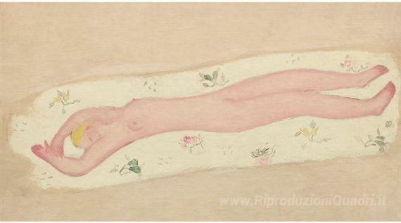 Ti offriamo una riproduzione artigianale su tela dell'opera famosa 'Rosa Nudo su foglio floreale' di Sanyu, dal Museo delle Riproduzioni.