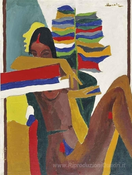 Ti offriamo una riproduzione artigianale su tela dell'opera famosa 'Senza titolo' di M.F. Husain, dal Museo delle Riproduzioni.