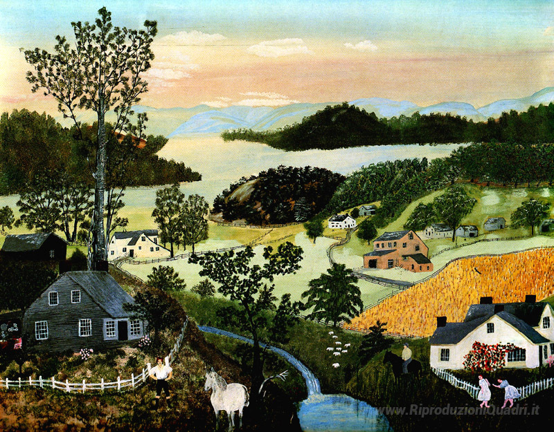 Ti offriamo una riproduzione artigianale su tela dell'opera famosa 'A Beautiful World' di Grandma Moses, dal Museo delle Riproduzioni.
