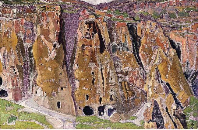 Ti offriamo una riproduzione artigianale su tela dell'opera famosa 'Abitazioni rupestri (Arizona)' di Nicholas Roerich, dal Museo delle Riproduzioni.