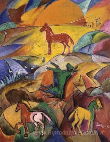Ti offriamo una riproduzione artigianale su tela dell'opera famosa 'Alba sulle steppe' di David Burliuk, dal Museo delle Riproduzioni.