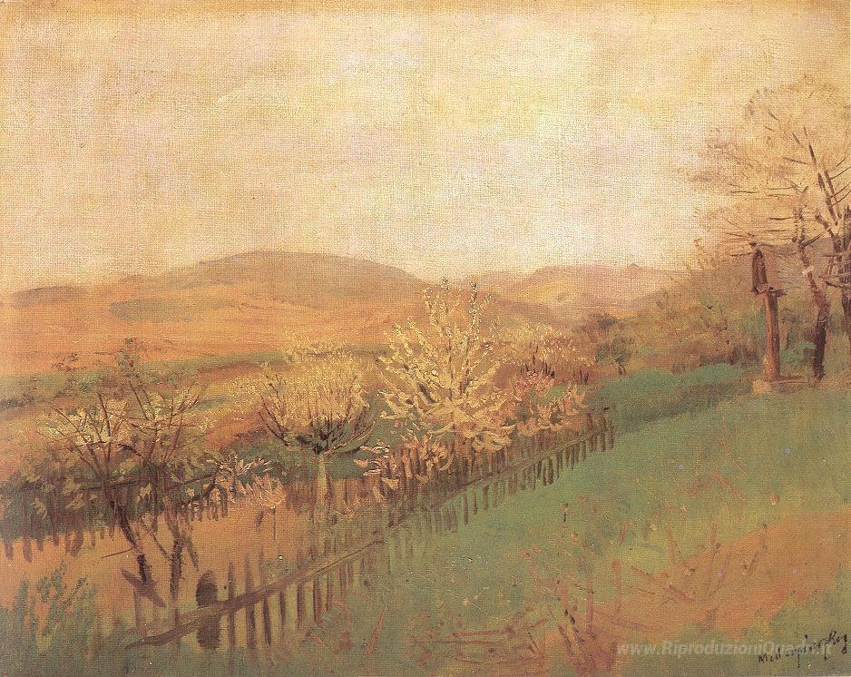 Ti offriamo una riproduzione artigianale su tela dell'opera famosa 'Alberi da frutta' di Laszlo Mednyanszky, dal Museo delle Riproduzioni.